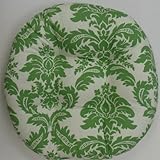 2 (Two) x 15 Inch Round Cushion in the NORFOLK design.This sale is for a set of 2 (TWO) Cushions. Norfolk is apple green and cream in a fleur de lis design. MADE IN THE USA. Approx Dimensions are 15" in diameter x 3" thick. These are lovely, thick, quality cushions that are reversible. Good for round bistro chairs. Also available in 17 inch round cushions for $37.95 a pair. 100% Polyester OUTDOOR fabric, blown polyester filling. Button effect. Designed for outdoor use. We do accept returns, but before you order please read our returns policy and measure carefully. Please note, design colors on your screen may not reflect the actual cushion colors due to differences in monitors and computer settings.