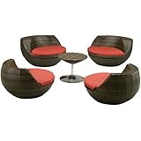Warmly inviting and ultra sturdy, Strathwood's Cantina seating collection features a bold, modern design and classic comfortable touches. The five-piece set includes four chairs and a matching round conversation table. For storage, the smaller chairs stack into the larger ones, fitting together to form egg-shaped units. The easy-to-display, easy-to-store design makes for one of the most versatile outdoor seating collections around. Constructed with sturdy, durable frames wrapped in espresso-colored, PE-coated rattan wicker, the set masks dirt and stands up to the elements. Four polyester cushions in crimson red fabric are also designed sturdy for outdoor use. Overall, the stacked chairs for storage measure 43 by 43 inches. Each of the smaller chairs measures 21-1/2 inches deep by 35-1/2 inches wide by 30 inches tall and weighs 22 pounds. The larger ones measure 21-1/2 inches deep by 42-1/2 inches wide by 41-1/2 inches tall and weigh 24 pounds. The table has a 23-inch diameter, stands 14-1/2 inches high, and weighs 13 pounds. Part of Strathwood's fully coordinating Cantina collection, the 5-piece seating set helps turn any regular yard or patio into a mini paradise. Peruse the rest of the Cantina collection for beautiful, matching pieces.
