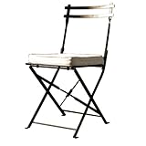 With the flip of your wrist this sturdy handmade wrought iron chair folds completely flat for easy off-season storage or transport.Requires no tools for assembly or break down.The attractive powder-coated finish protects the chair from rusting when left outdoors and is weather resistant year round. No garden, pool or patio table setting is complete without a set of these versatile folding dining chairs and their elegant, comfortable design. Removable cushion included. These chairs were specifically designed to fall within the size limits of UPS transportation saving money on shipping costs. Cushion is unbleached, natural cotton. Powder-coated wrought iron can be wiped down with a damp cloth.Cushion cover is removable and can be machine-washed.The Folding Dining Chair is pictured here with our Round Bistro Table.For the perfect set up, order a pair of the Folding Dining Chairs and our Round Bistro Table!