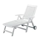 Constructed of High Impact Resin, has 4 reclining back positions, drop down foot section, large wheels for easy maneuverability, unique Safety-Fold track and latch, folds for storage, wheel assembly required.