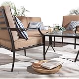 (More customer reviews)I spent a long time shopping online for inexpensive outdoor furniture that's also stylish, so I was pleased to find this 4-piece set with clean lines. It was easy to put together, and it's sturdy enough to meet our needs. The cushions are a little thinner than you might find on the more expensive furniture, but the chairs and love seat are still comfortable. Overall, I think it's a good product for the price.